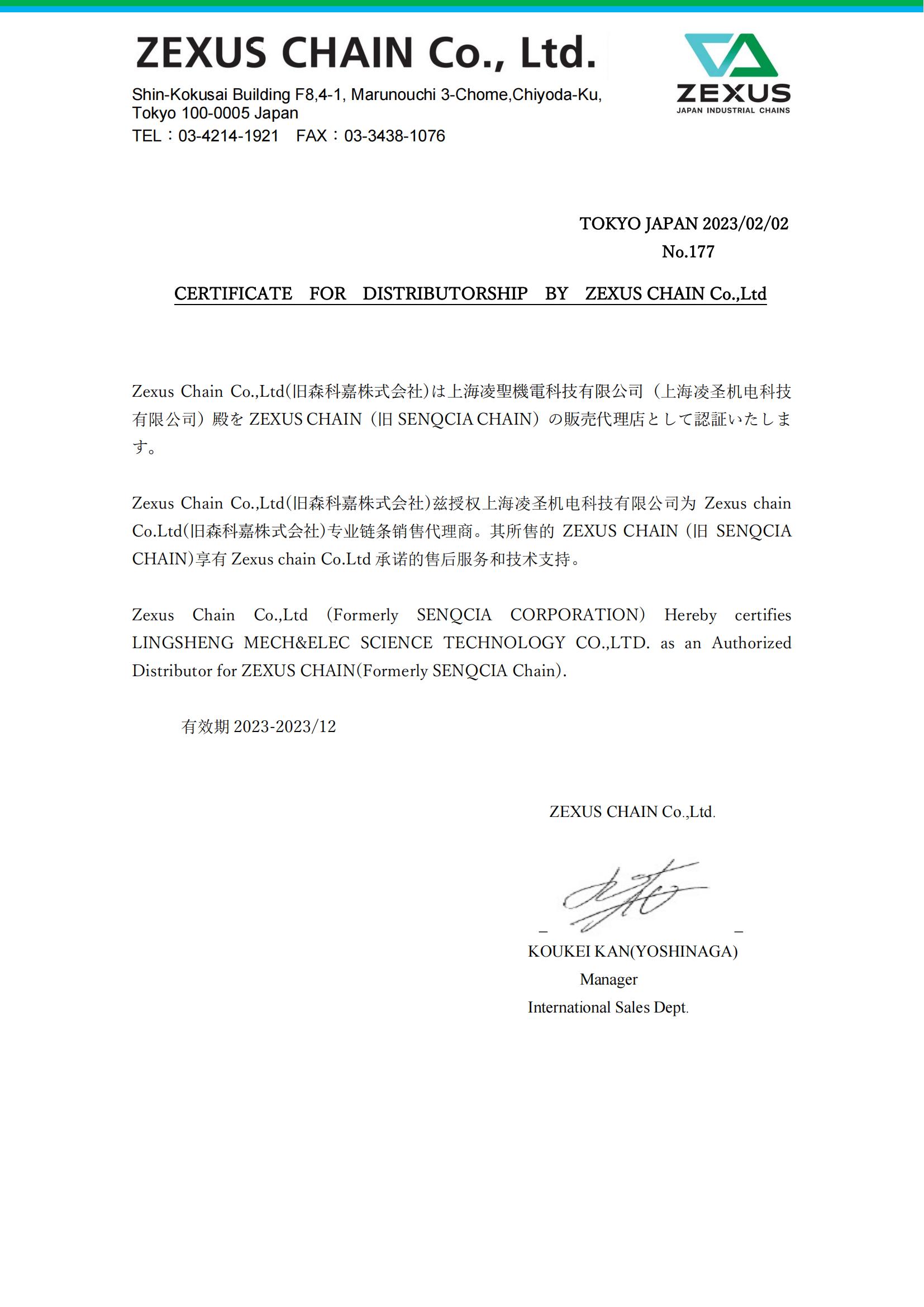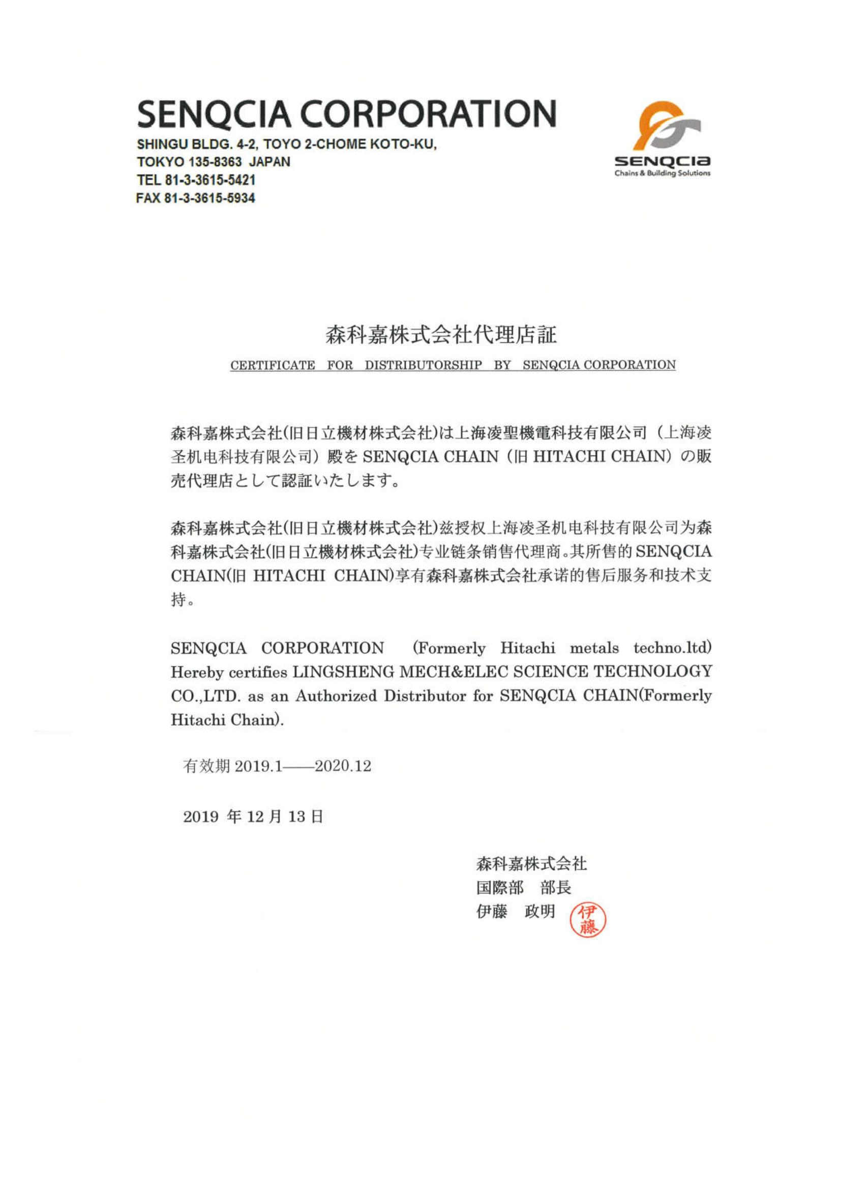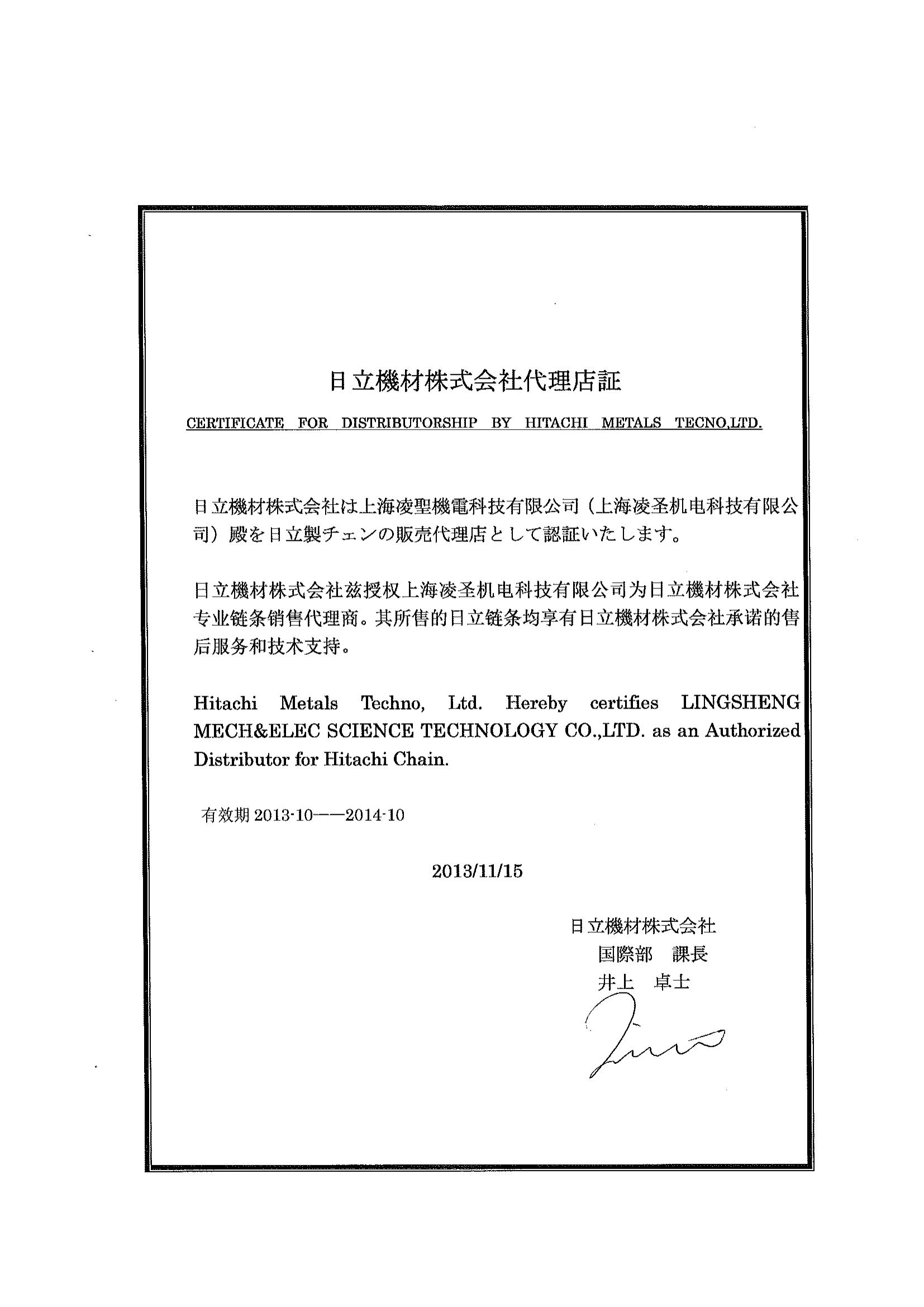 椿本鏈條授權(quán)代理證